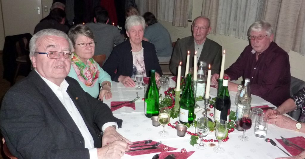 Die ankommenden Sänger mit Damen wurden mit einem Glas Sekt empfangen. Vorstand Bernd Engler begrüßte alle Anwesenden, bedankte sich bei Brigitte und Werner Hahn für die tolle Dekoration und Ausgestaltung des Raumes, wünschte einen gemütlichen Abend und einen Guten Appetit. Die Vorspeise (Feldsalat) wurde serviert. Anschließend konnte man den von Bernd Engler, Erwin Parison und Walter Männlin ausgegebenen Hauptgang zu sich nehmen und ausgiebig nachschöpfen. Nun folgte zur Auflockerung ein erster Liederblock der Sänger mit Liedern aus dem Liederheft.